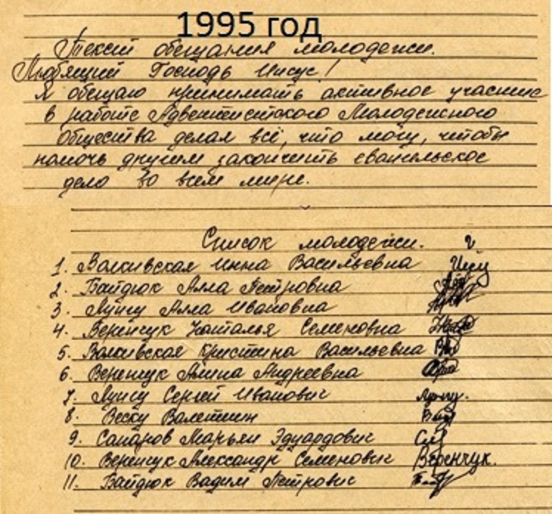 1995 год. – В один из прекрасных субботних дней состоялось торжественное служение – это посвящение молодёжи христианской церкви Адвентистов Седьмого Дня г. Флорешты НА РАБОТУ и СЛУЖЕНИЕ Адвентистского Молодёжного Общества.