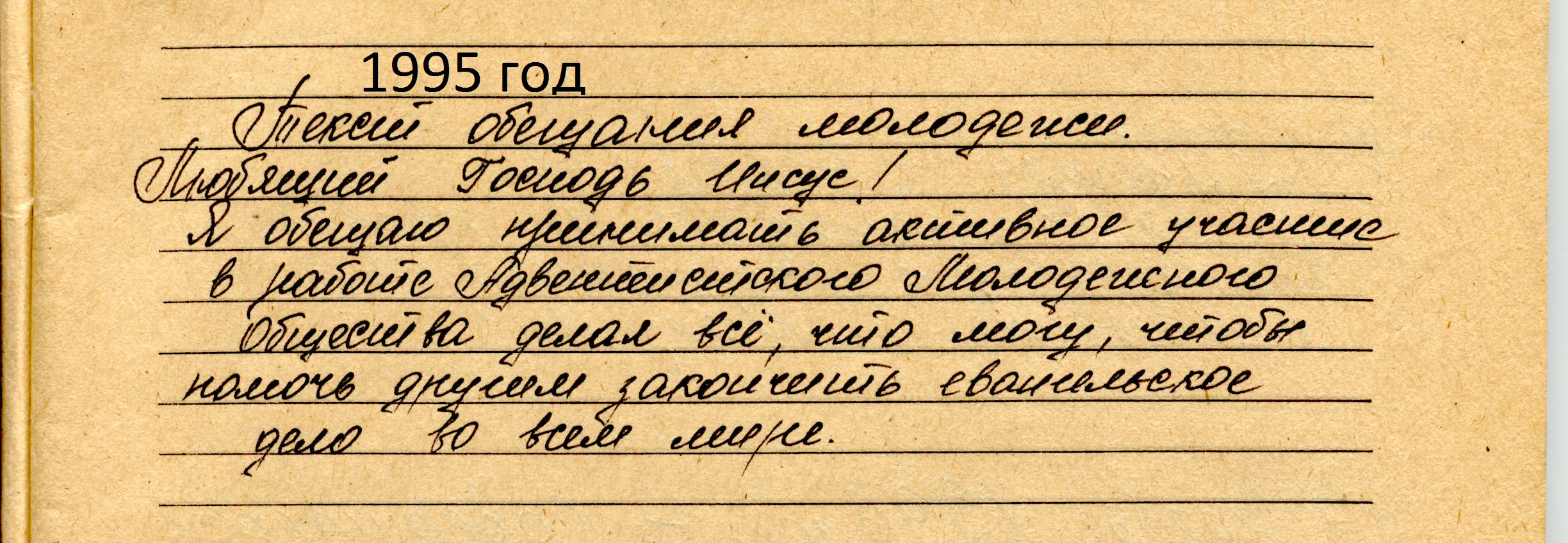 Текст обещания молодежи следующий: - ЛЮБЯЩИЙ ГОСПОДЬ ИИСУС! Я ОБЕЩАЮ ПРИНИМАТЬ АКТИВНОЕ УЧАСТИЕ В РАБОТЕ АДВЕНТИСТСКОГО МОЛОДЕЖНОГО ОБЩЕСТВА ДЕЛАЯ ВСЕ, ЧТО МОГУ, ЧТОБЫ ПОМОЧЬ ДРУГИМ ЗАКОНЧИТЬ ЕВАНГЕЛЬСКОЕ ДЕЛО ВО ВСЕМ МИРЕ.